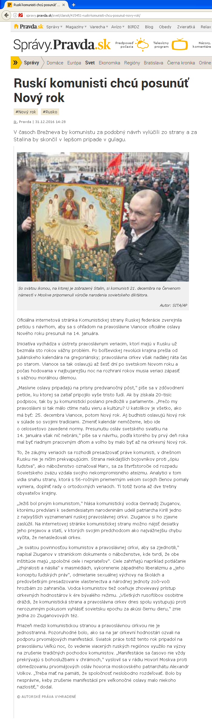 V Rusku komunisti zašli až tak ďaleko, že zo Stalina robia svätca. Alebo azda až boha ako vnímajú kresťania Ježiša? Neviem, ale synkretizmus ako vyšitý. Doslova bláznivý. V článku Ruskí komunisti chcú posunúť Nový rok uverejnenom v denníku Pravda 31. decembra 2016 sa píše: